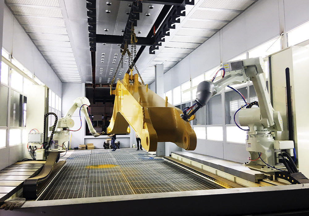 此外,挖掘机动臂斗杆喷涂自动生产线、球友会(中国)铲斗焊接自动生产线上,各种机器人系统正在各条生产线上有序运转。在相同产能下,每班人员仅需2人,人员减少12人,场地减少一半,物料流转次数减少3倍。