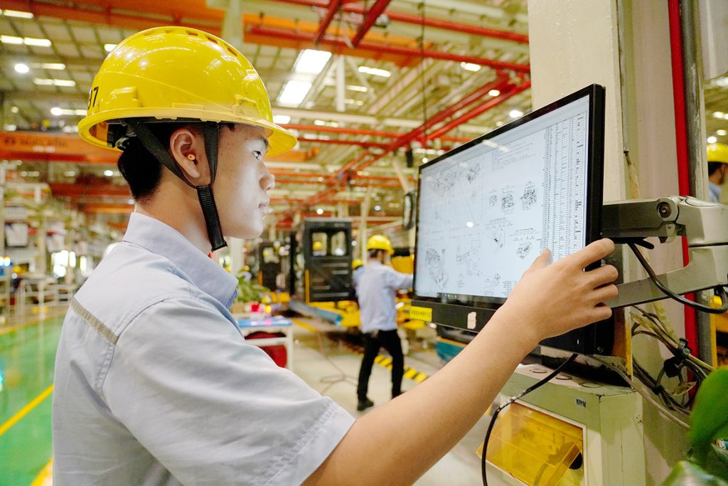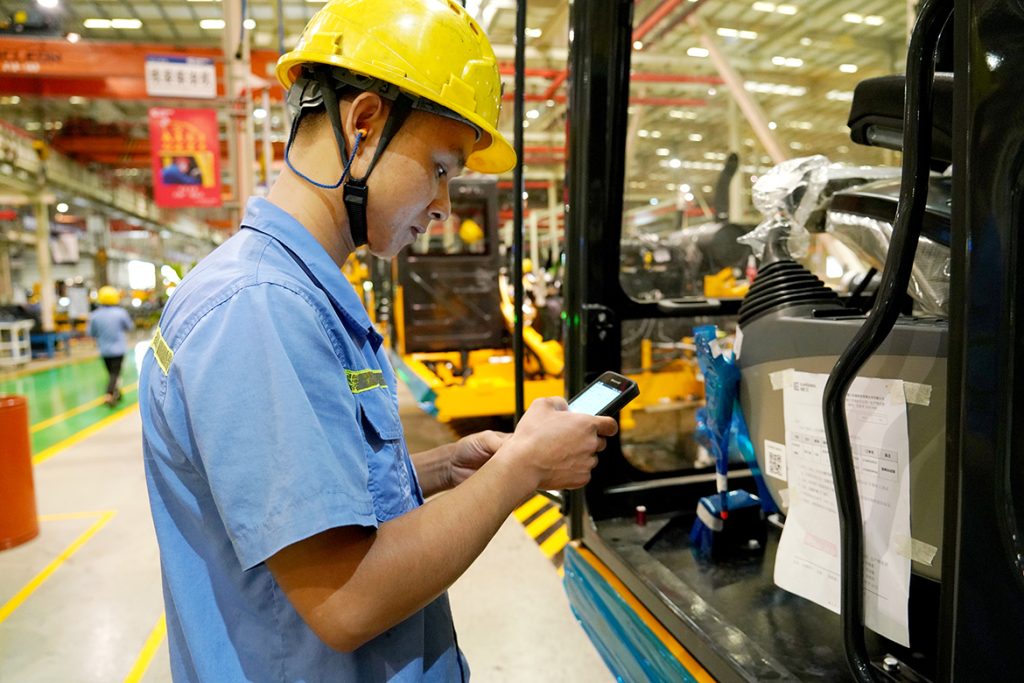 “自从用了MES之后,我们的工作效率和准确性得到大幅提升。原先每道工序都需要手写各种报表、签字确认,流程繁杂,容易出错,现在‘扫一扫’就能轻松搞定了!”9月23日,笔者走进球友会体育挖掘机公司总装厂装配车间,看到装配钳工谢森光正通过手持终端PDA扫描工位上的二维码,一扫就能轻松在线查询作业指导书进行装配,同时,他所做的每道工序都能被记录在内。